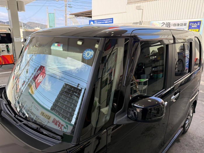 ガラス窓に超撥水ガラスコーティングを施したら、眩しいほどに燦めくN-BOXの完成です…!